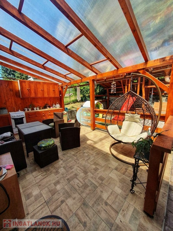 A hátsó, fedett teraszon szintén elhelyeztünk egy nyári konyhát, amelyben tűzhely és konyhabútor is helyet kapott, így a nagyon hideg téli hónapokat leszámítva az év bármely részében használható.