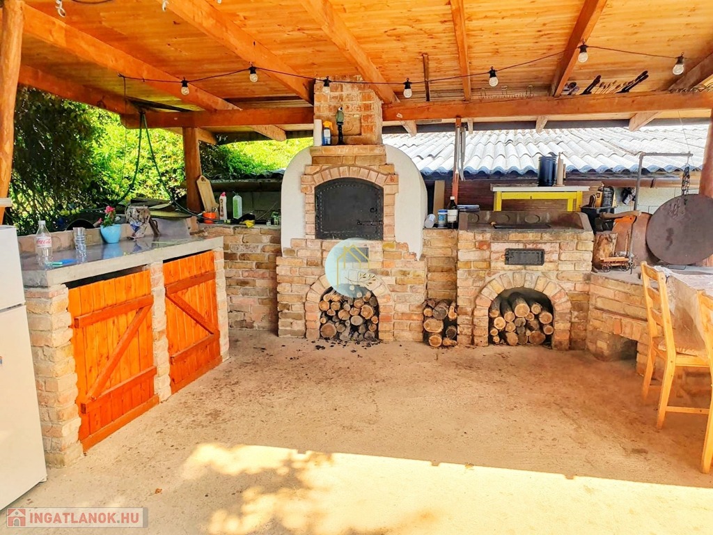A borospince hangulatához jól passzol a garázs mellett téglából kiépített/kialakított nagyjából 35 négyzetméteres fedett teraszon lévő nyári konyha, körbe U alakban ülőkével, búbos kemencével, és beépített grillezővel, bográcsozó/szalonnasütővel. Mely akár 20 fő vendégfogadására is kiválóan alkalmas - és itt a rendrakáshoz kialakított mosogató, lefolyó is helyet kapott. Mosogatógép és hűtő is telepíthető a burkolt tálalópult alá. (nekünk volt).