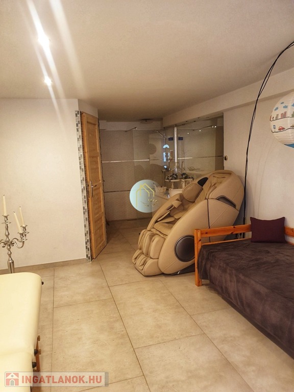 A szuterén szinten található külön bejárati ajtón át egy kisebb wellness részlegbe érkezünk, ahol megtalálható egy elkezdett szauna (csak lambériázni kell), egy különálló wc, és zuhanyzó rész, valamint a kedvelt masszázs részlegünk. Akár vállalkozásnak is megfelelő méretű, külön bejáratú helyiség ez – jelenleg konditeremként szolgál, fitness gépekkel felszerelve, melyek alku tárgyát képezhetik. A házzal egy egységet képez a lenti szint, de leválasztható, azaz külön főbejáratú is egyúttal!